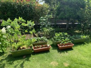 今回は5月にトマト、きゅうり、ピーマン、オクラ、いんげん、すいか、小松菜、万能ネギを植えました。